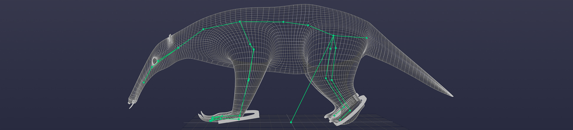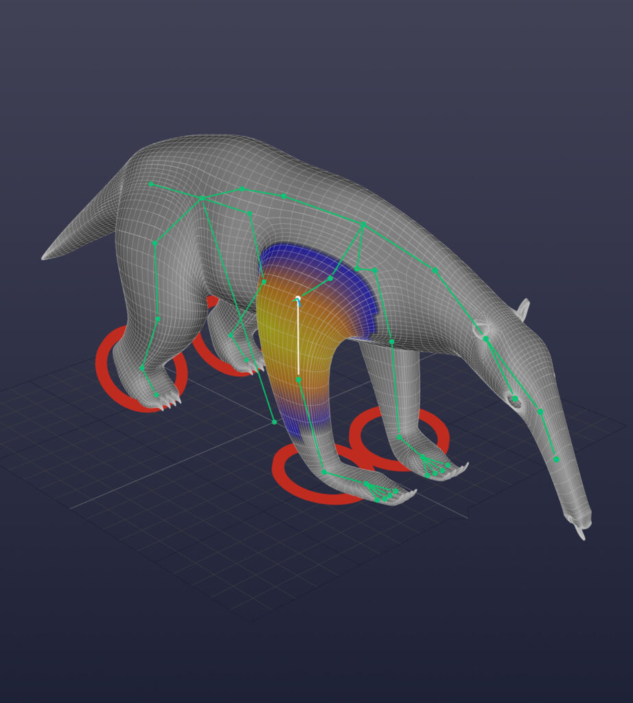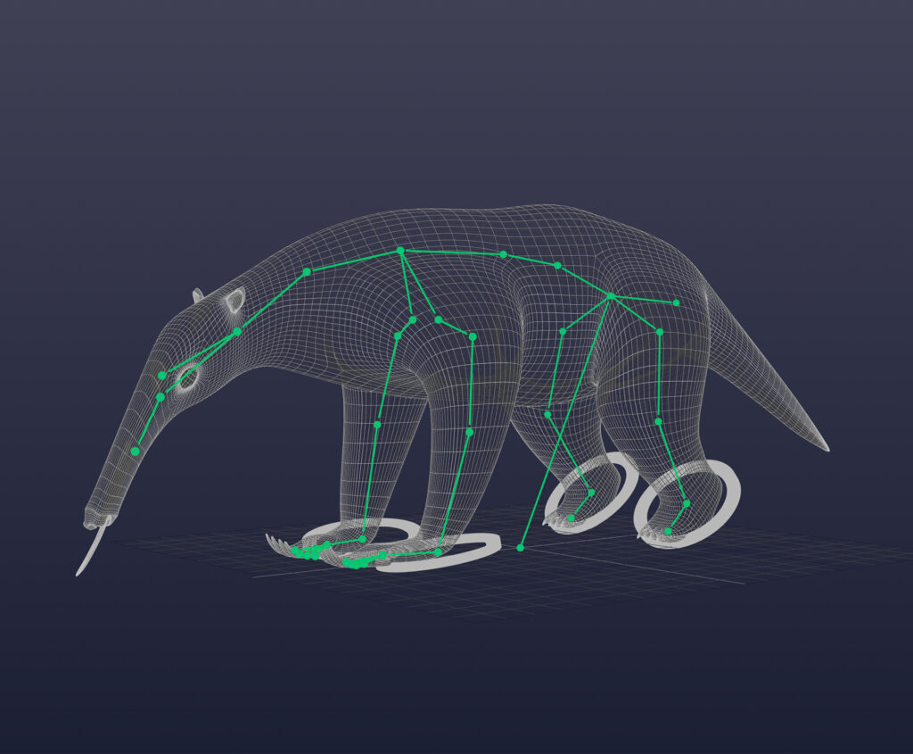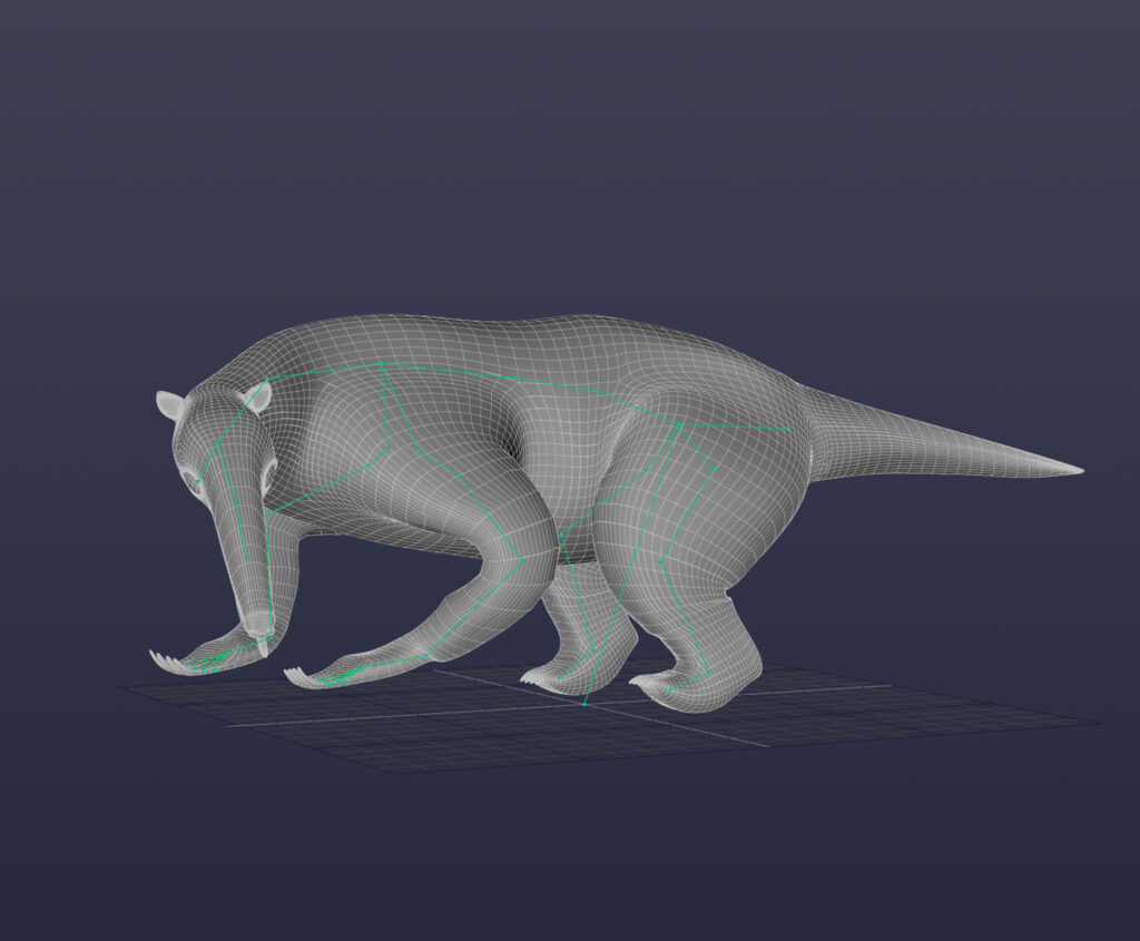 Este pequeño oso hormiguero se riggeó y se animó para una capsula de Televisión en la cuál se hablaba del calentamiento global. Se le colocaron huesos en todas sus extremidades para lograr una amplia variedad de movimientos. De igual manera cada uno de los huesos se pesó de manera individual para que la piel tuviera el movimiento más natural posible.
